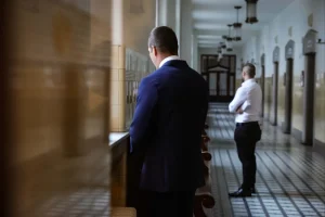 B. Dávid és vádlott társa, L. Márton szabadlábon, elegáns ruhában érkeztek a bíróságra. Előbbi sötétkék öltönyt, a másik férfi fehér inget és fekete nadrágot viselt.